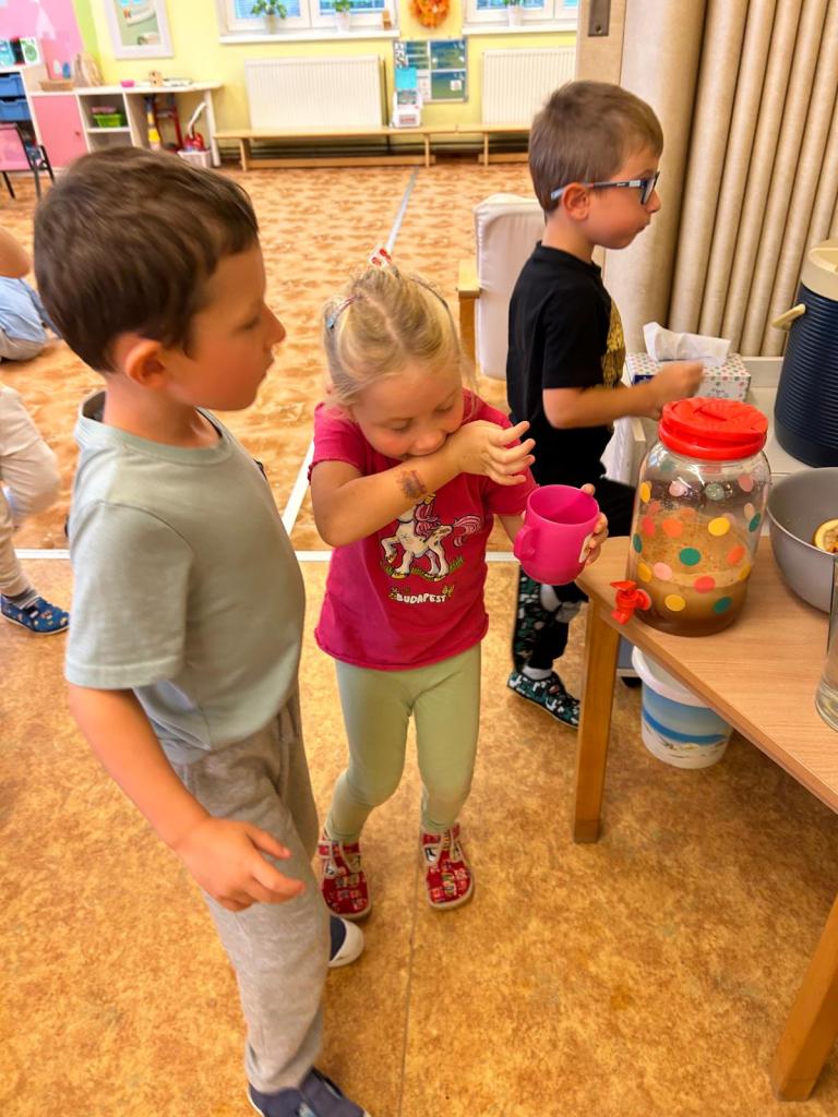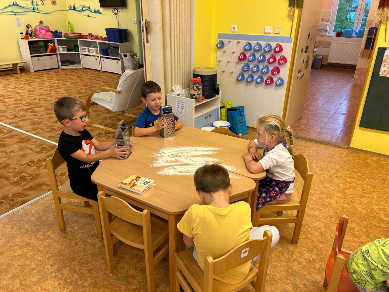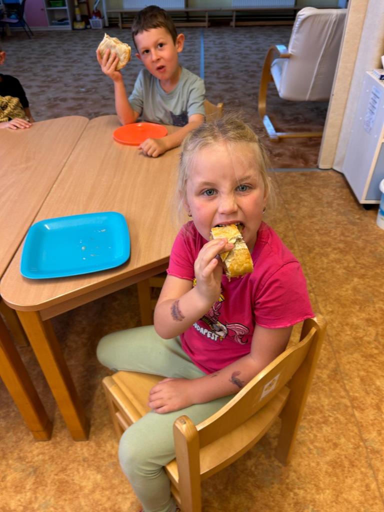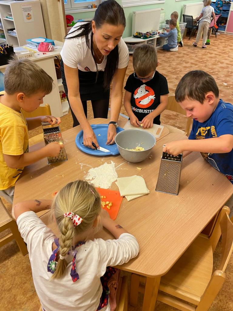 Děti se samy pustily do práce – strouhaly jablka, krájely, válely těsto, zavinovaly i mazaly. Všechny kroky zvládly s velkým nadšením. Paní kuchařka nám štrúdlíky upekla a my jsme si pak společně pochutnali na sladké odměně.